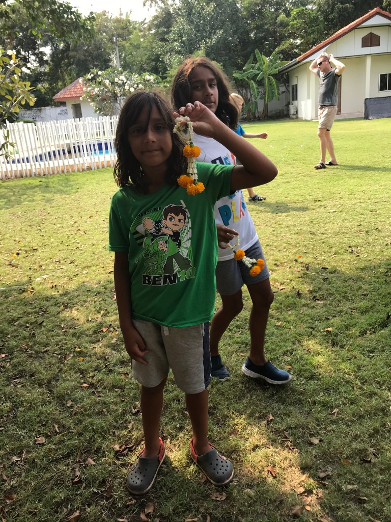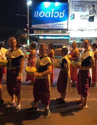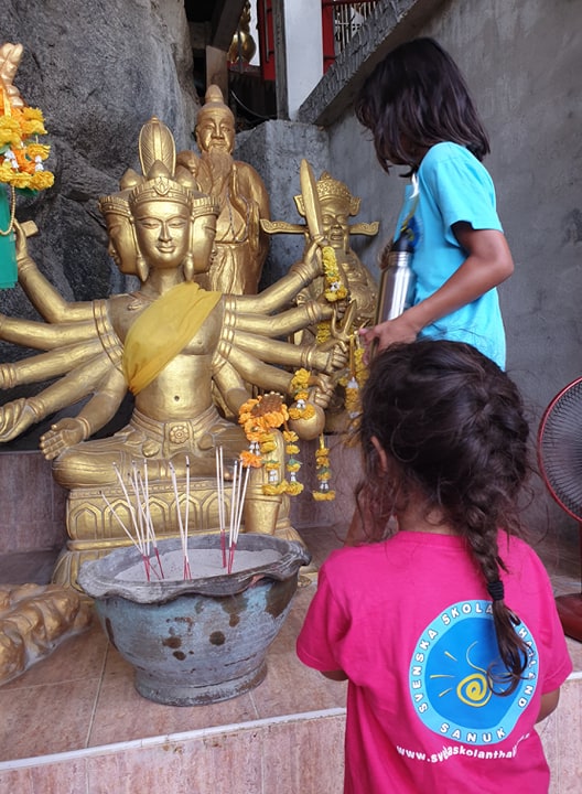 Saker som hänt i Thailand är bland annat att det varit munkar på vår skola. Munkarna välsignade skolan och alla var tvungna att sitta stilla i en timme med fötterna bortvikna från munkarna. Dom sjöng en ramsa i ca 20 min i sträck. Vi har fått göra pom malais; det är girlanger av blommor som för tur med sig där man hänger dem. Vi har också fått lära oss att vika handdukar till figurer. Vi har gjort batiktröjor.